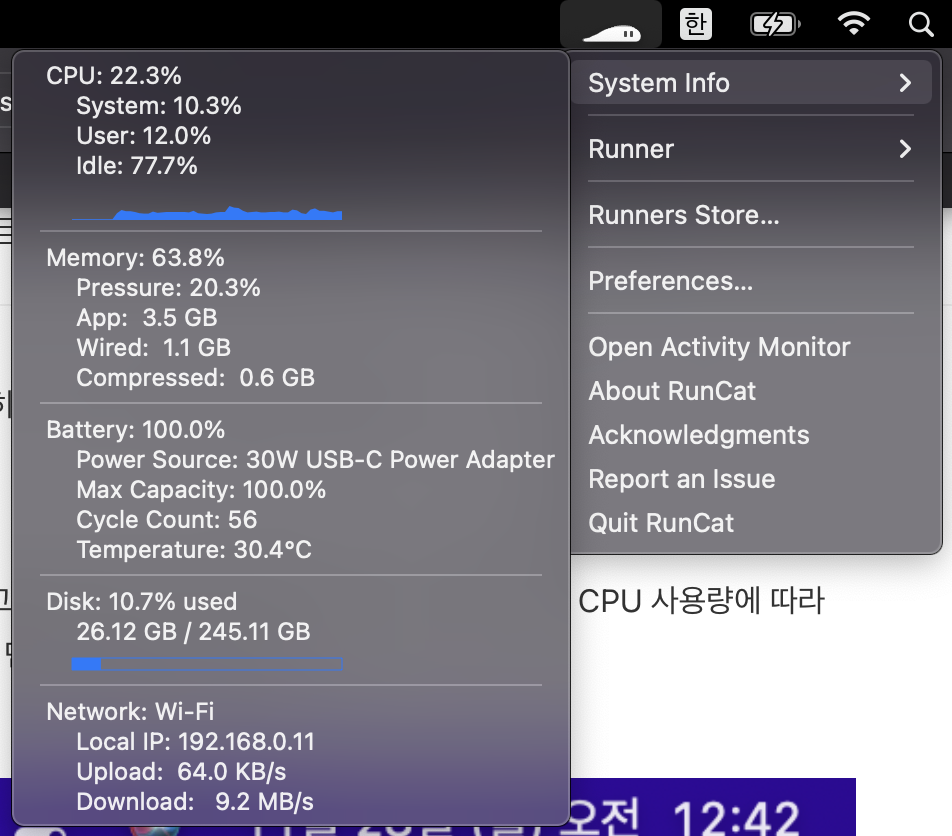 상단 바에 귀여운 고양이 추가, 설정에서 로그인 시 실행되도록 하자. 고양이는 여러 다른 동물로 바꿀 수 있으며 현재 CPU 사용량에 따라 움직이는 속도가 빨라진다. 나는 슬라임으로 설정해 두었다.