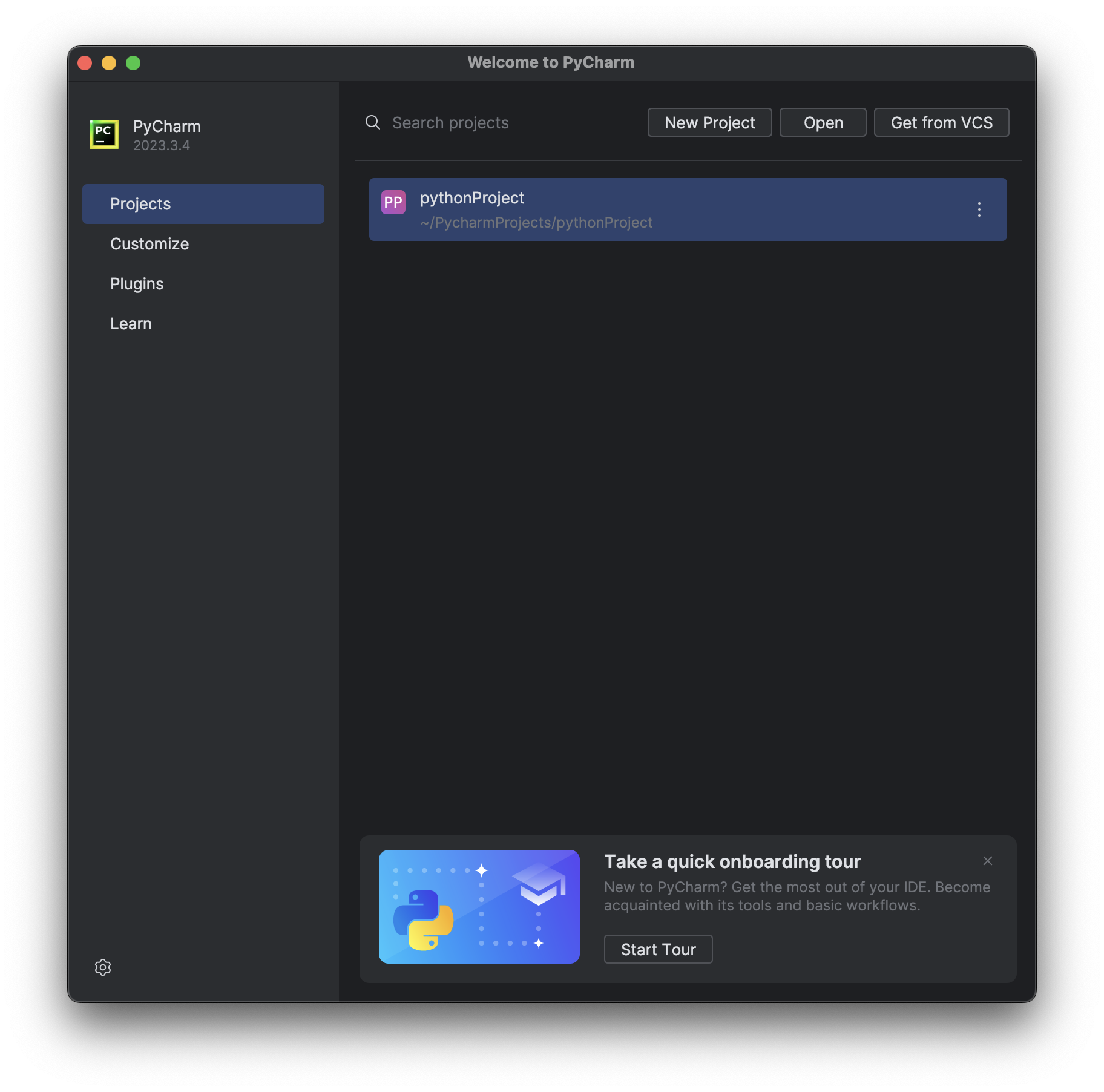 Pycharm을 설치 후 실행하면 위와 같은 화면이 뜰 것이다. (pythonProject는 보이지 않는 것이 정상이다.) Plugins에 들어가, Korean Language Pack을 설치하구 재시작하면 한글로 PyCharm을 이용할 수 있다. 선택은 자유이지만 앞으로의 과정은 한글 언어팩이 설치된 상태라고 가정하고 진행할 것이다.